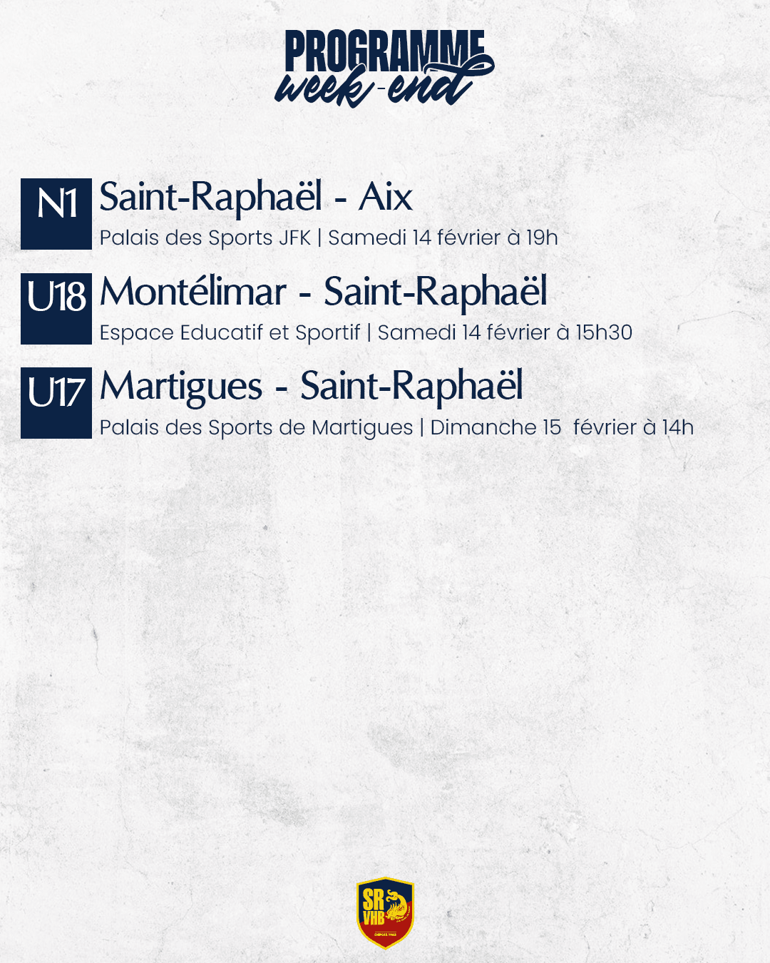 Découvrez le programme des équipes du Saint-Raphaël Var Handball pour ce week-end :