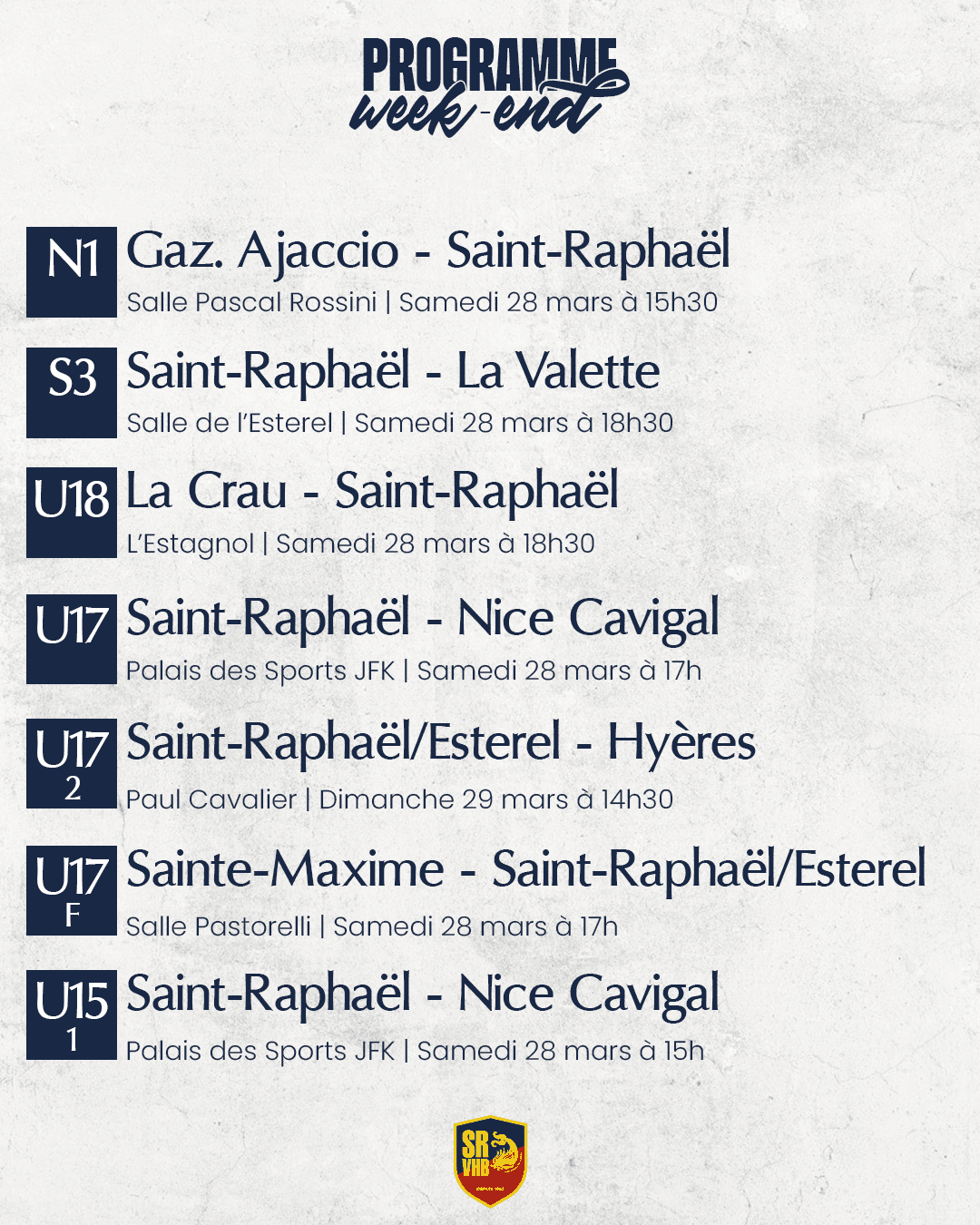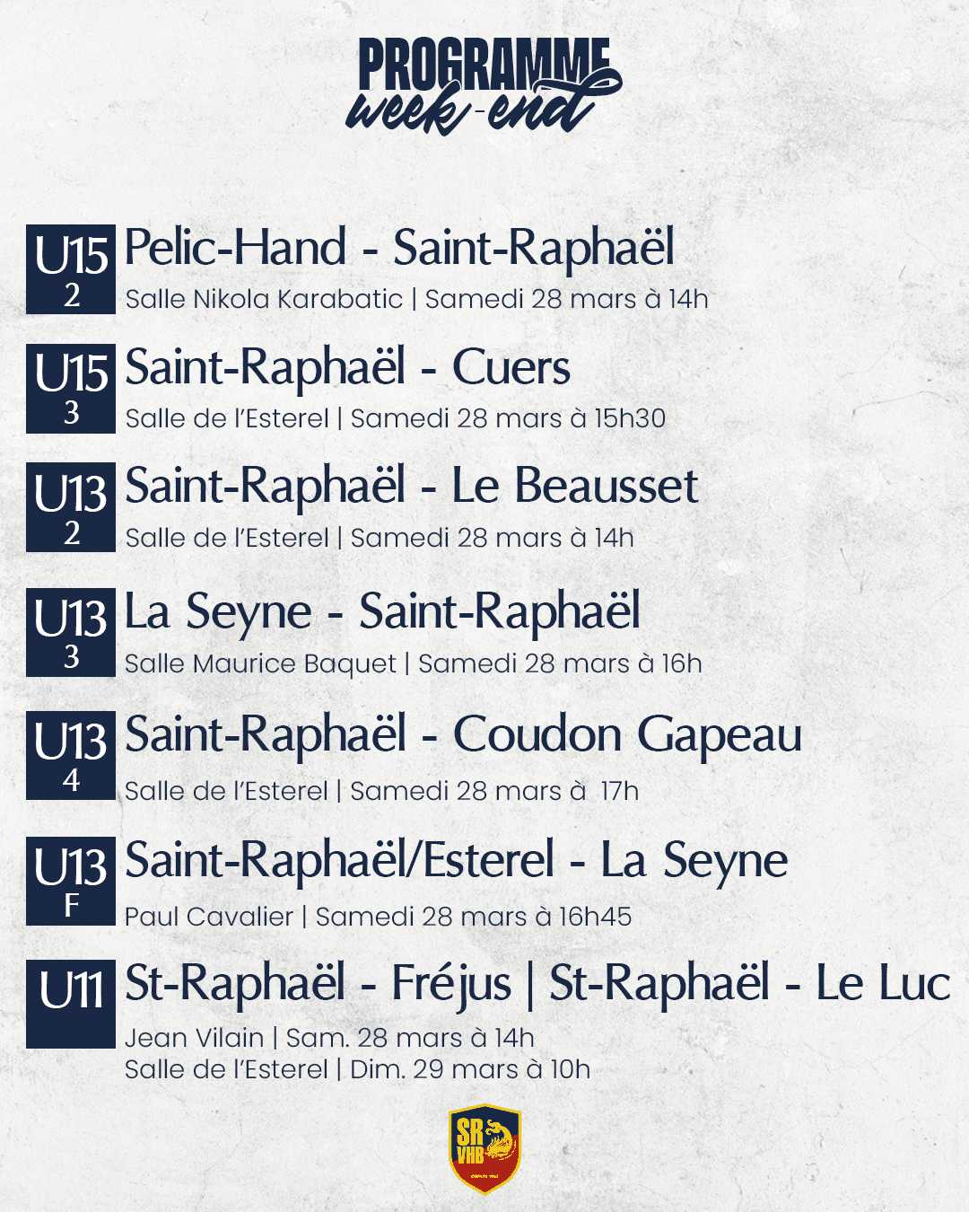 Découvrez le programme des équipes du Saint-Raphaël Var Handball pour ce week-end :